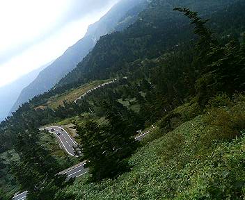 カーブを登って、まさに雲の上に・・。横手山ドライブインから今まで来た道を見ると、ゴーカートのコースみたい。おもしろい。よくこんな道作ったよなーって感心する。